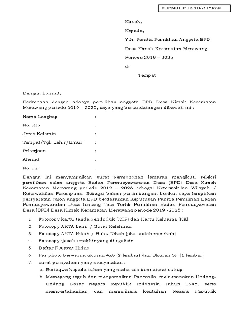 Download Formulir Pendaftaran Calon Bpd - Contoh Surat Lamaran Calon Anggota Bpd Info Desa / Formulir pendaftaran ppk dan pps.. Hamka yang berada di maninjau kecamatan tanjung raya kabupaten agam, pada tahun ini insyaa allah telah membuka penerimaan calon santri baru untuk tahun ajaran 2021/2022. 30 downloads 521 views 37kb size. Melalui artikel ini bpjs online akan memberikan informasi link download formulir bpjs kesehatan silahkan anda cetak untuk keperluan pendaftran anda. Sugeng siang, wassalamu'alaikum wa rahmatullahi wa barakatuh. Download formulir pendaftaran siswa paud tk kb tpa doc tahun ajaran.